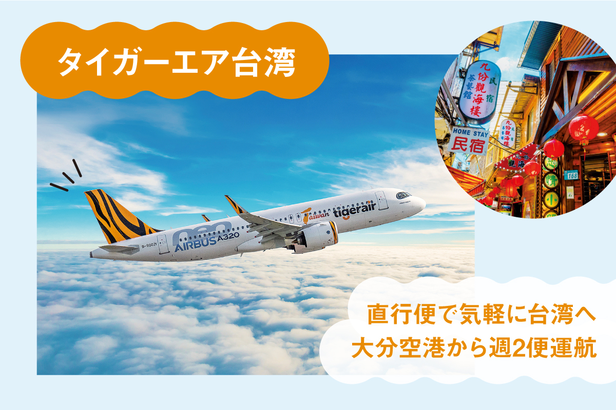 昨年4月に大分空港へ就航した、台湾唯一の格安航空会社(LCC)「タイガーエア台湾」。台北郊外に位置する台湾桃園国際空港と大分を、週2便の直行便で結んでいます。チェックインから機内サービスまでシンプルでわかりやすく、初めてのLCC利用でも安心して搭乗できるのが特徴。また、受託手荷物や機内食などを必要に応じて追加できるため、自分の旅のスタイルに合わせたプランニングが可能です。