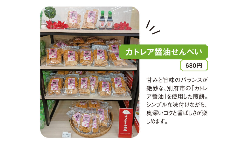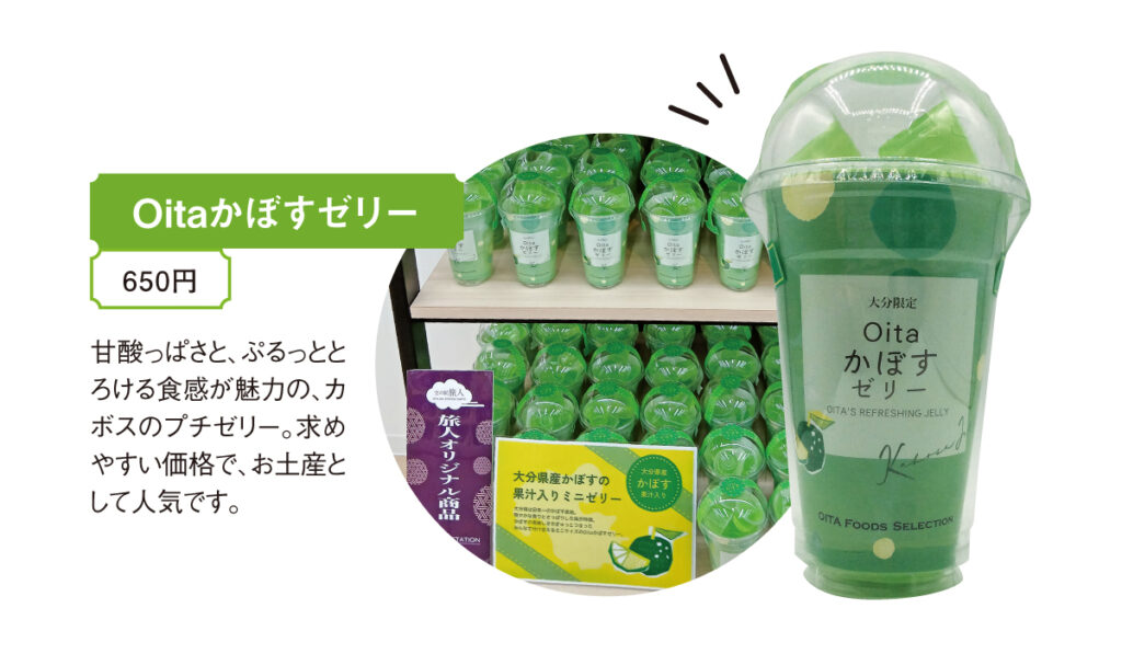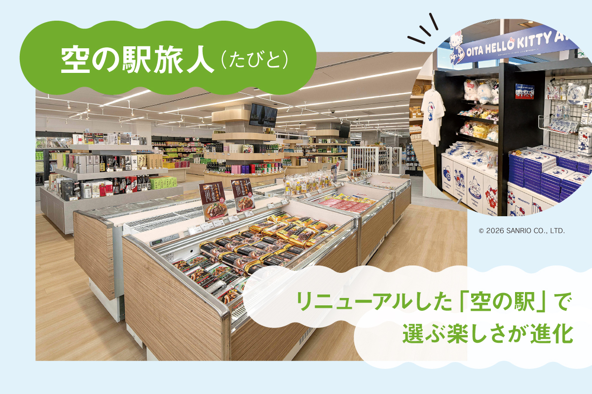 県内最大級の3000アイテム以上が揃う、土産物のセレクトショップ「空の駅 旅人」。「大分らしさ」・「楽しさ」・「選びやすさ」をコンセプトに昨年7月、明るく広くリニューアルしました。県内選りすぐりの加工品などの名品や、「旅人」オリジナル商品も充実。季節ごとの商品入れ替えや各種フェアも開催されるため、地元の人でも訪れるたびに新たな発見があります。